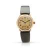 Hand-wound 15 jewel movement, two-tone champagne dial with applied numerals, subsidiary seconds, blued steel hands, circular three-piece 9k gold Dennison case with fixed lugs and reverse with presentation inscription. Dial and movement signed.