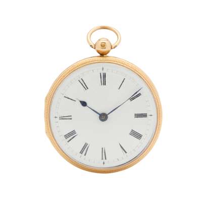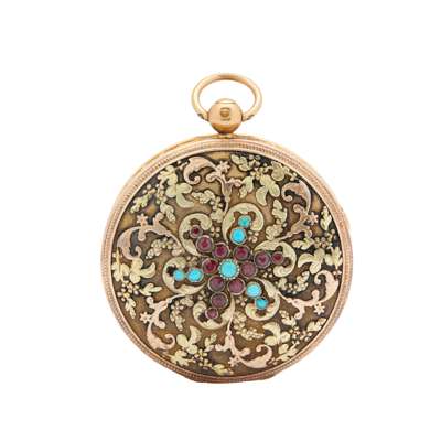 Key-wind movement, white enamel dial, case with European marks, turquoise and garnet reverse.