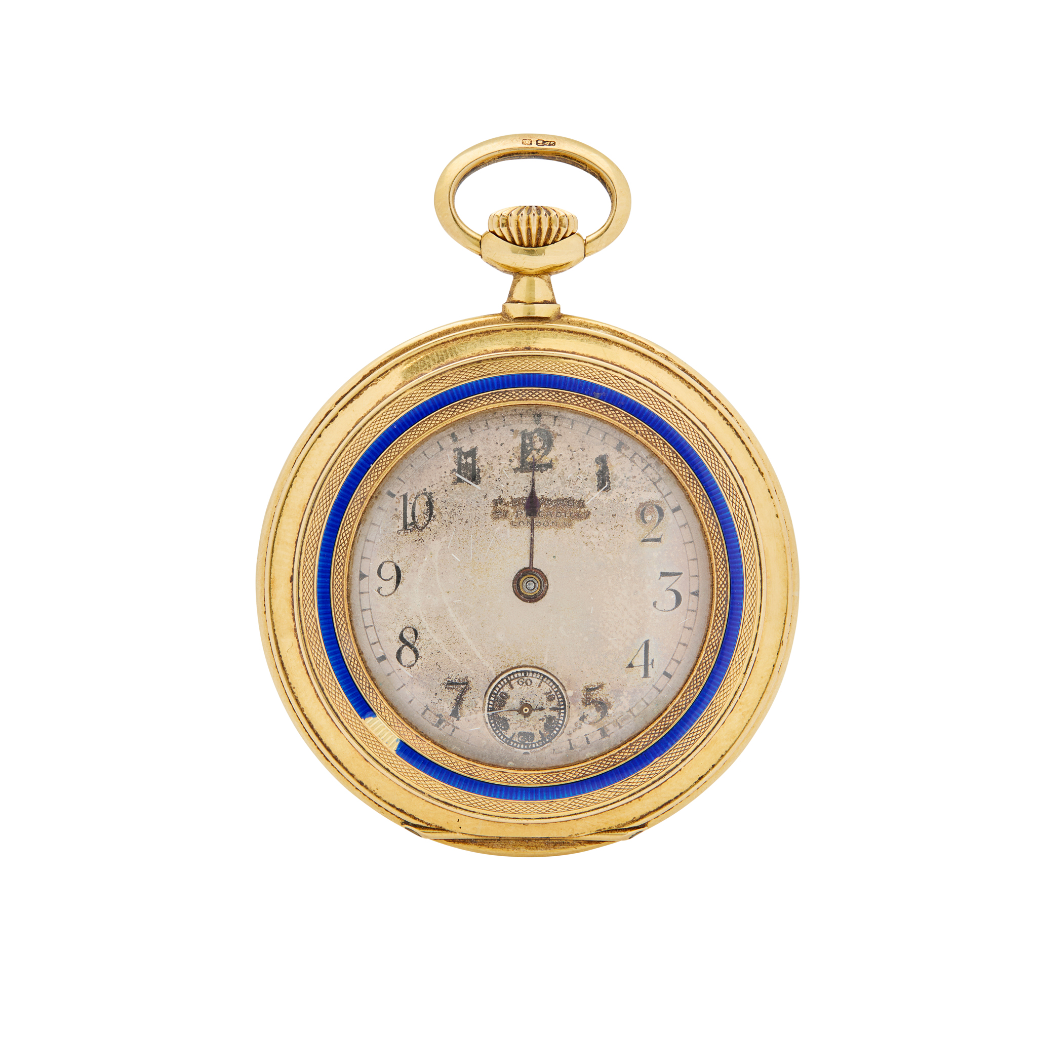 Keyless rhodium movement, silvered dial with subsidiary seconds, circular hinged case with engine-turned bezel and reverse with blue enamel ring. Unsigned movement, case numbered.