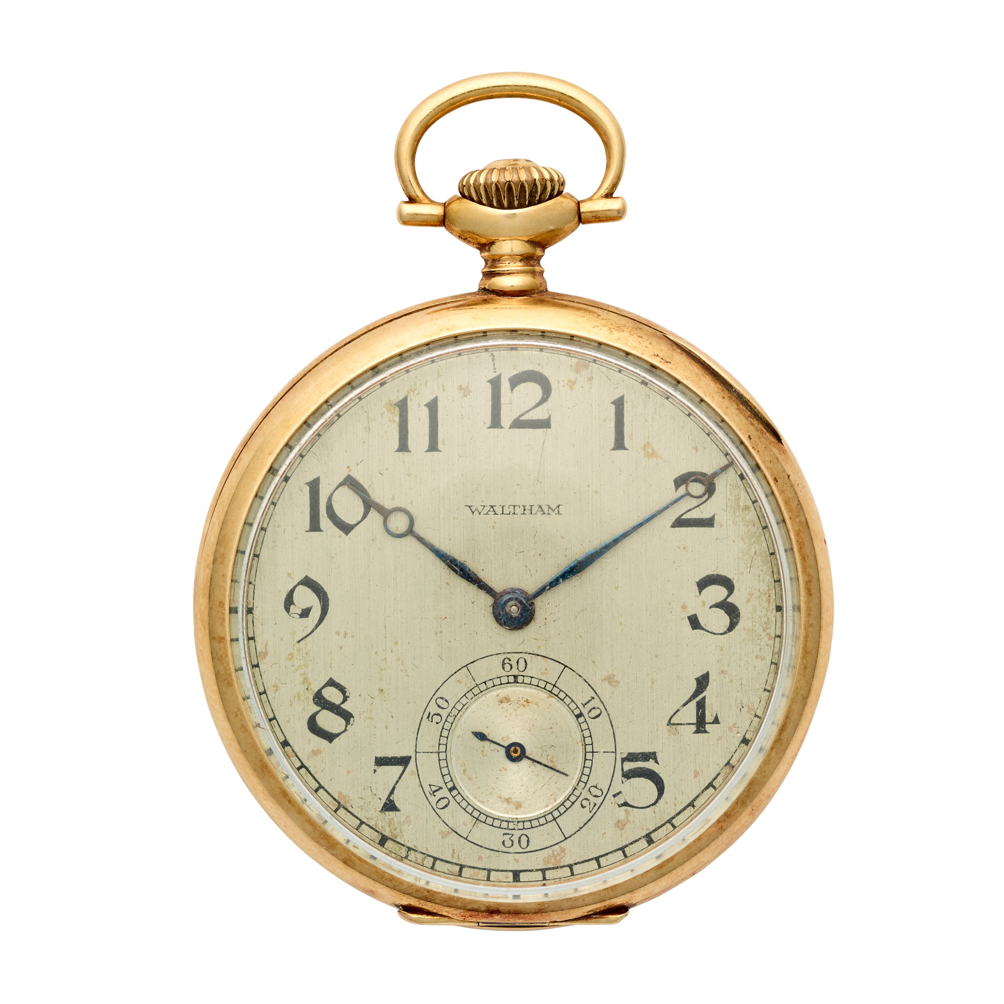 Keyless mechanical movement, silvered dial, hinged 14k gold case. Dial and movement signed,