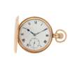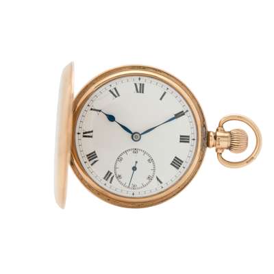 Hand-wound nickel plated movement, white enamel dial with black Roman numerals, outer minute track, subsidiary seconds, blued steel hands, hinged 9k gold Dennison full hunter case with monogram to the front cover dated June 1932, plain cuvette. Movement signed.