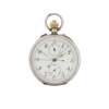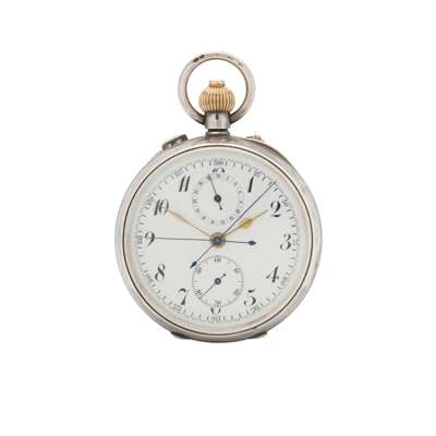 Keyless winding mechanical movement with steel chronograph works, white enamel dial with black Breguet numerals, outer minute track, subsidiary dials for running seconds and 30 minute chronograph register, gilt spade hands, blued steel chronograph seconds hands, silvered (.925) hinged case with engine-turned reverse with decorative central blank cartouche, oval split chronograph button to the band, plain cuvette. The case stamped WHT for William Horace Thompson who was registered 1908-1913. Accompanied by what appears to be the original card case with image on the cover labelling the watch ‘The Ascot’ complete with retailer Weil & Co, 111 Hatton Garden, London and stamped address to J.Levy, 92 Abbots Ford Place, Glasgow.