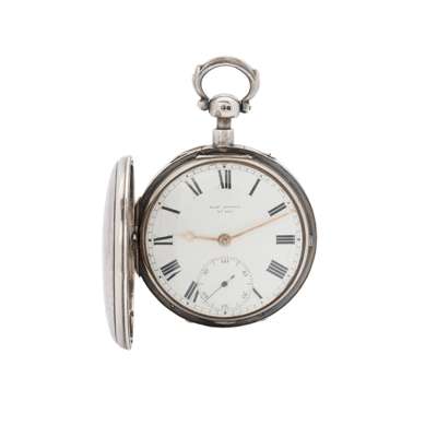 Key-wind full-plate movement with duplex escapement, diamond end-stone, white enamel dial with black Roman numerals, subsidiary seconds, gilt hands, substantial silver hinged full hunter case with brass cuvette, engine-turned cover and reverse, two slides within the flat band, one to release the cover, the other to lock the push-pull stem repeat plunge. Dial and movement signed and numbered.