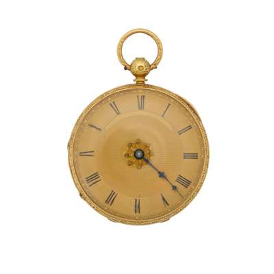 Gilt three-quarter plate movement with lever escapement, champagne dial with guilloche centre, outer Roman numerals, blued steel hands, decorated hinged 18k gold case with with winding holes to the cuvette, movement signed and numbered, case numbered and stamped with makers mark R.G.M. Accompanied by a rosewood pocket watch stand.
