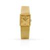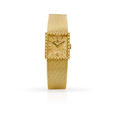 Cal775, manual winding movement, textured champagne dial, applied indexes, baton hands, rectangular case with numbered reverse, decorated bezel, on integral 18k gold fine-link bracelet. Case, dial and movement signed, case with maker's stamp, hammer 117 and importer stamp F.K. Accompanied by a green Baume & Mercier presentation case.