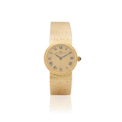 Hand-wound mechanical movement, textured champagne dial with Roman numerals, blackened leaf hands, circular 18k yellow gold case, cabochon-set crown, textured bezel, on integral 18k yellow gold Baume & Mercier bracelet. Case, dial and movement signed. Accompanied by a green Baume & Mercier presentation case.