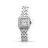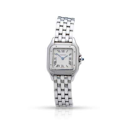 Quartz movement, white dial with black Roman numerals, blued steel hands, stainless steel with reverse and bezel secured by screws, cabochon-set crown, on fitted stainless steel Cartier bracelet with double folding clasp. Case, dial and movement signed.