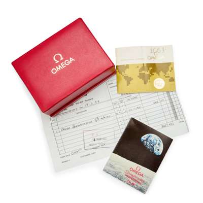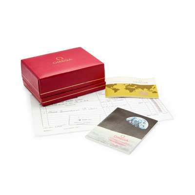 Cal.861 hand-wound 17 jewel movement, black dial with tritium baton indexes, outer minute track, subsidiary dials for running seconds, 30 minute and 12 hour registers, white luminescent hands, central chronograph seconds hand, stainless steel case with screw-down reverse featuring central Speedmaster logo and ‘Flight-Qualified By NASA For All Manned Space Missions - The First Watch Worn On The Moon’, chronograph buttons to the band, sculpted shoulders, on fitted stainless steel Omega Ref.1171 bracelet with 633 endlinks, folding clasp. Case, dial and movement signed, case also stamped C.R.S. for casemaker Charles Renee Spielman. Accompanied by the original Omega red presentation case, Speedmaster booklet, numbered Omega warranty dated 18.3.83 and hand-written Mapping & Webb Ltd (Edinburgh) sales receipt for £345 dated 18.3.83.