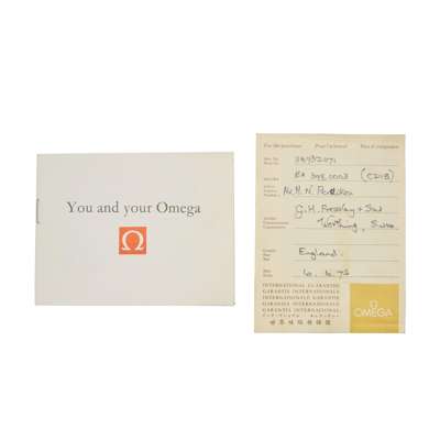 Cal.916 (Omega Cal.1250) electronic tuning-form movement, champagne dial with applied gold baton indexes, inner tritium dots, further black batons, date aperture, baton hands, red centre seconds, 18k gold circular case with screw-down reverse, Omega crown, on fitted 18k gold Omega Ref.1125/617 bracelet, clasp stamped with London 18k import assay for 1973. Case, dial and movement signed, inner case with London 18k import assay for 1973. Accompanied by numbered Omega guarantee booklet dated 6.6.75, period instruction booklet and Omega service case.