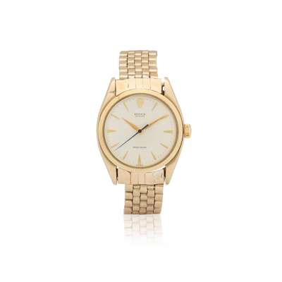 Cal.1210 hand-wound 17 jewel movement, white dial with applied gilt indexes, gilt index hands, blued steel centre seconds, 9k gold case with screw-down reverse and Oyster crown, smooth bezel, inner case stamped with serial number 68774 and Glasgow import mark for 1961, on fitted Rolex ‘Made in England’ bracelet with folding clasp also stamped CT&Co with Birmingham 9k assay mark for 1960. Case, dial and movement signed.
