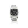 Self-winding movement, black dial, luminous baton indexes, date, stainless steel curved rectangular case on stainless steel bracelet with Omega clasp.