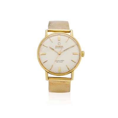Self-winding movement, silvered dial with baton indexes, 18k yellow gold circular case with SeaMaster motif to reverse, straight lugs, on associated 18k fine link bracelet. Accompanied by a red hardcase Marvin box.