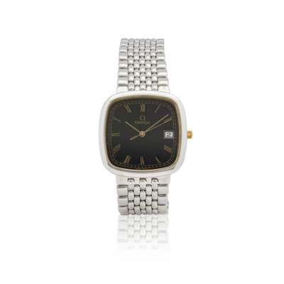 Quartz movement, black dial with gilt Roman numerals, date, cushion shape steel case on stainless steel bracelet with sliding Omega clasp.