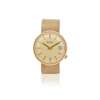 Cal.2181F electronic movement, champagne dial with applied baton indexes, date, baton hands, centre seconds, 9k gold circular case with reverse secured by a screw-down ring, in integral 9k gold fine link bracelet with hallmarked clasp. Accompanied by a Bulova Accutron presentation case within a card outer and instructions.