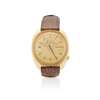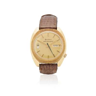 Cal. 2242, electronic movement with tuning fork regulation, two-tone textured/smooth gilt dial with applied baton indexes, applied Bulova logo and diamond, baton hands, centre seconds, aperture for day and date, tonneau shape 14k yellow gold case with reverse secured by a screw-down ring, faceted upper, on brown leather strap with gilt Bulova pink buckle.
