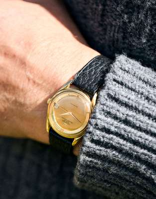 Self-winding movement, two-tone champagne dial with date, 18k yellow gold case with screw back, on black strap with associated 9k gold bracelet. Accompanied by a similar period Universal red presentation box.