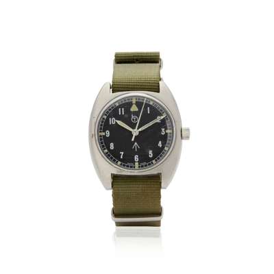 Hand-wound mechanical movement, matt black unsigned dial with broad arrow insignia, tritium designation, one-piece stainless steel tonneau shape case with numbered reverse, solid strap bars, on green NATO style strap. Unsigned, numbered.