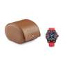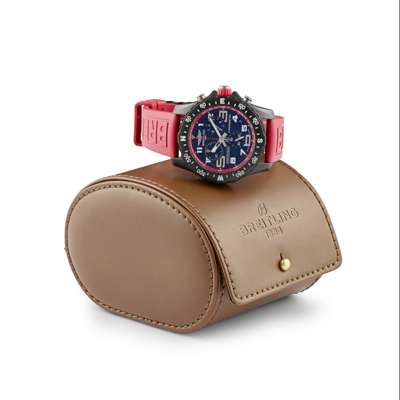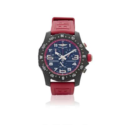 Cal.82 quartz 4 jewel movement, black dial with applied luminous numerals, subsidiary dials for 30 minute & 1/10th second chronograph registers, running seconds, date between 4/5 numerals, applied Breitling logo, outer raised red pulsations scale, luminous baton hands, red chronograph hands, black composite ‘Breitlight’ case with screwed down numbered reverse, red-coated crown, bidirectional rotating bezel calibrated to 360 degrees, on red Breitling rubber strap with black coated Breitling buckle. Accompanied by a numbered Breitling digital warranty card, start guide, tan leather Breitling travel case within card outer.