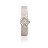 Hand-wound 17 jewel movement, silvered dial, 18k white gold circular case with diamond set bezel on integral 18k white gold bracelet. Case, dial and movement signed.