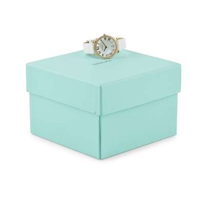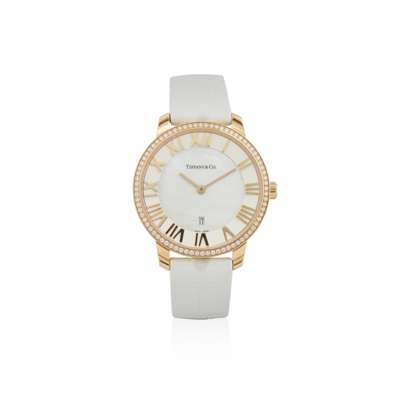 Quartz movement, central mother-of-pearl dial to raise outer set with Roman numerals, date, baton hands, 18k pink gold circular case signed and numbered to the reverse with London hallmark, diamond set bezel, on white alligator Tiffany & Co strap with 18k pink gold Tiffany & Co buckle. Accompanied by a Tiffany & Co black presentation case within signature blue card outer.