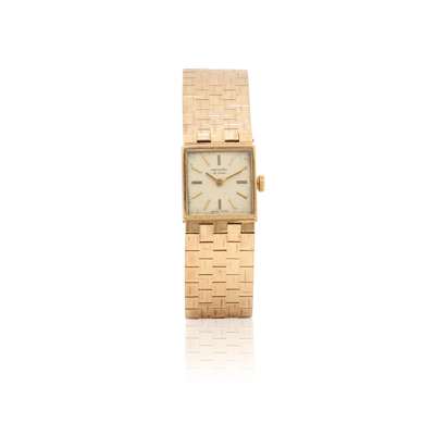 Hand-wound movement, square silvered dial, 9k yellow gold square case with integral brick-link bracelet.
