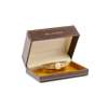 Hand-wound mechanical 17 jewel movement, champagne dial with black batons, 9k gold cushion shape case with 25 years service presentation inscription on reverse to Mrs L. D. Moody, on integral textured link 9k gold bracelet. Accompanied by a presentation case with the same name, Mrs L. D. Moody to the front.