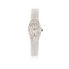Cal.BM550 hand-wound mechanical 17 jewel movement, textured silvered dial with applied quarter batons, baton hands, 18k white gold tonneau shape case with diamond set upper to integral 18k white gold fine link bracelet. Case, dial, movement signed.