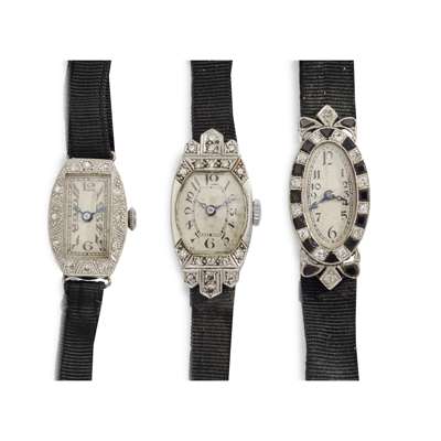 1 Hand-wound mechanical movement (missing crown), silvered dial, hinged oval shape cases with single-cut diamond and onyx bezel and shoulders on fabric strap. 2. Hand-wound mechanical movement, silvered sunburst dial, hinged oval case with single-cut diamond upper, on fabric strap. 3. Hand-wound mechanical movement, silvered dial, hinged tonneau shape case with single-cut diamond upper, on fabric strap.