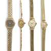 1 Universal, Geneve, an 18k gold cushion case hand-wound mechanical movement, on associated 14k gold bracelet, approx. total weight 25.6g. 2 Doxa, a 14k gold circular case hand-wound mechanical movement, on associated 14k gold bracelet, approx. total weight 24.2g. 3 Tryumph, 14k gold tonneau shape, hand-wound mechanical movement, on expanding link bracelet, one link broken, approx. total weight 10g. 4 Eterna, stainless steel two-tone case, quartz movement, on associated plated bracelet.