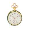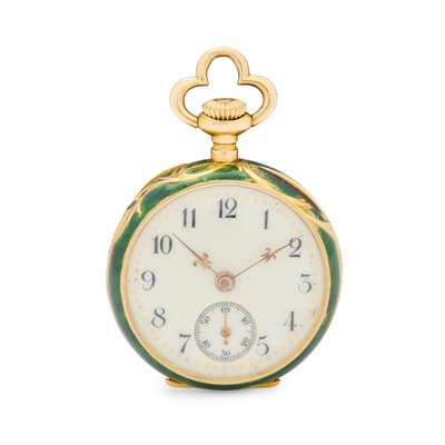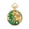 Hand-wound mechanical lever escapement, white enamel dial, black numerals, circular hinged 18k gold case with bezel, band and reverse decorated in translucent green enamel, stone set reverse.