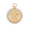 Key-wind fusee-chain movement with continental balance bridge, gilt engine-turned dial, hinged case with split-pearl bezel and matching reverse to central applied foliate and ruby star pattern. Unsigned. Unstamped and untested case metal. Accompanied by a fitted Hancok Cox & Co presentation case.