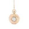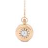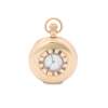 Hand-wound mechanical movement, white enamel dial with black Roman numerals, blued steel hands, circular hinged 9k gold Dennison case half-hunter case, enamel Roman numerals to cover, 9k gold lobster claw and ring clasps to yellow metal chain.