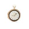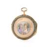 Key-wind fusee verge movement with Continental balance, white enamel dial, decorative hands, hinged circular case with couples enamel portrait to reverse, with glazed protective outer. Unstamped and untested metal case.