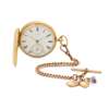 Key-wind movement, white enamel dial hinged through the front, full hunter hinged case stamped JW with London hallmarks, coin edge band, monogram to the cover. Short(165mm) 9k gold curb-link chain stamped to each link, with T-bar and fobs.