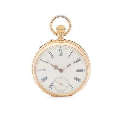 Hand-wound mechanical unsigned movement, white enamel dial, Roman numerals, circular hinged 14k gold open face case with metal cuvette.
