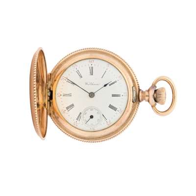 Keyless wind movement with safety barrel, white enamel dial, subsidiary seconds, hinged ‘Keystone’ watch case with decorative foliate outer. Dial and movement signed.