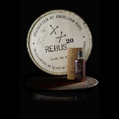 bottled to celebrate the 20th anniversary of Inspector John Rebus, with presentation case signed and doodled by Ian Rankin, the bottle and certificate of authenticity also signed by the author, 700ml/ 44.7%; together with HIGHLAND PARK REBUS 20 YEAR OLD CASK END, converted into a glazed table with polished oak legs, the top signed by Ian Rankin, 63cm diameter, 78cm high