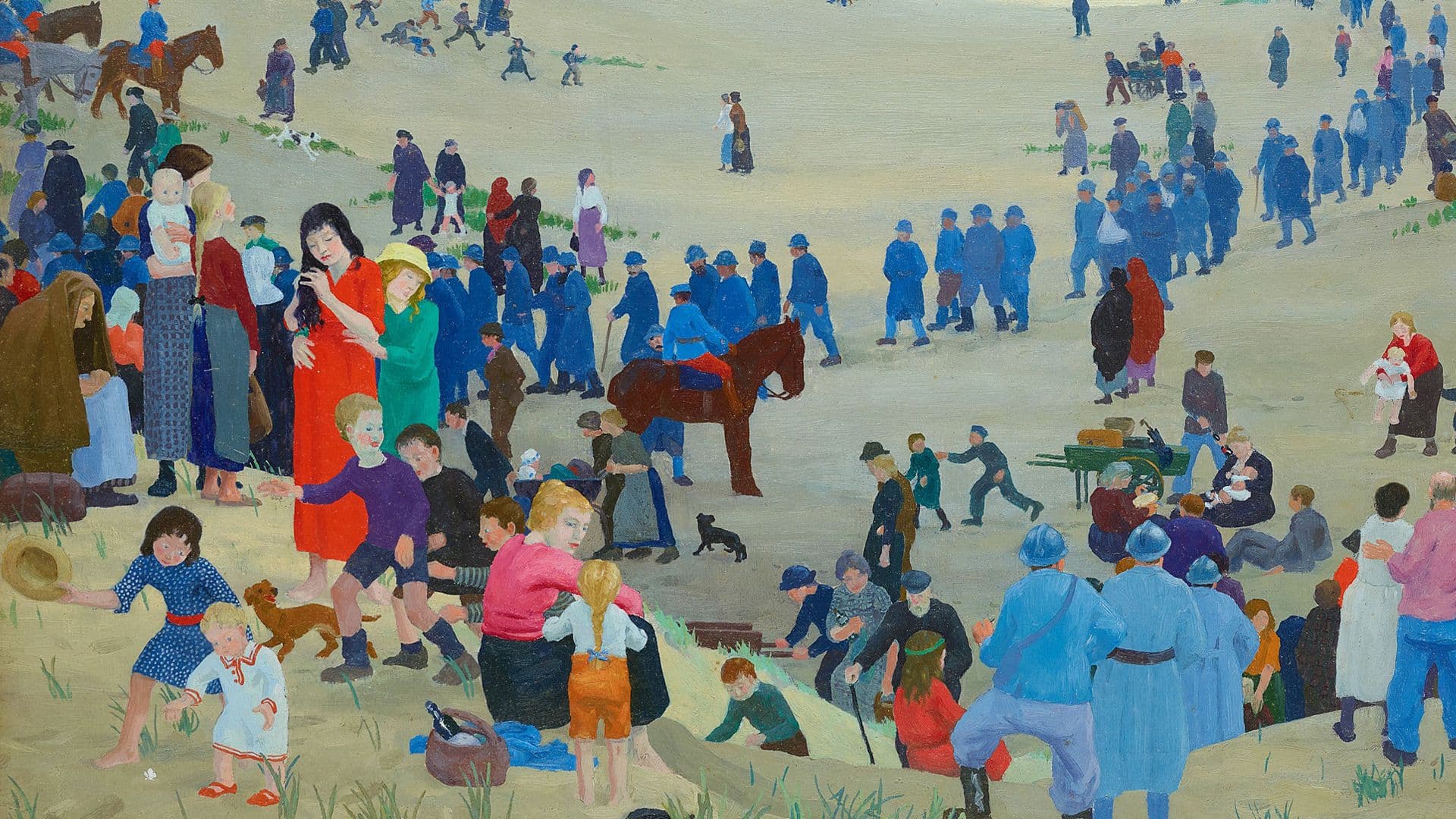 Worked up from notes and sketches made on the spot, it depicts the havoc caused as shelling from a German gun sited 20 miles away from the city prompted residents to flee. In vibrant colour and in great detail, Proctor depicts the nearby dunes strewn with soldiers and civilians that stream away from Dunkirk as it burns in the background. Despite its tragic subject matter vignettes include a picnicking family and children at play.