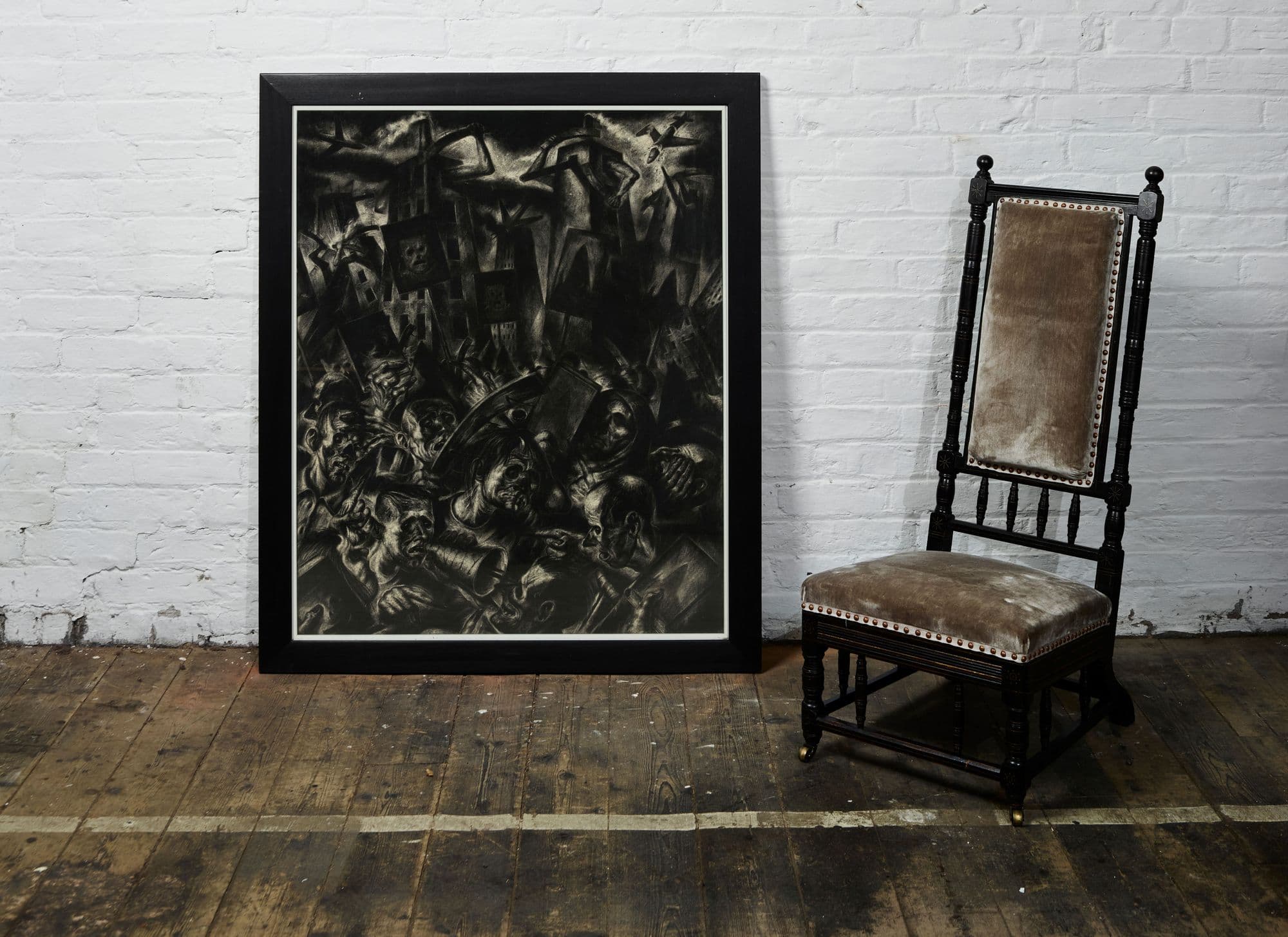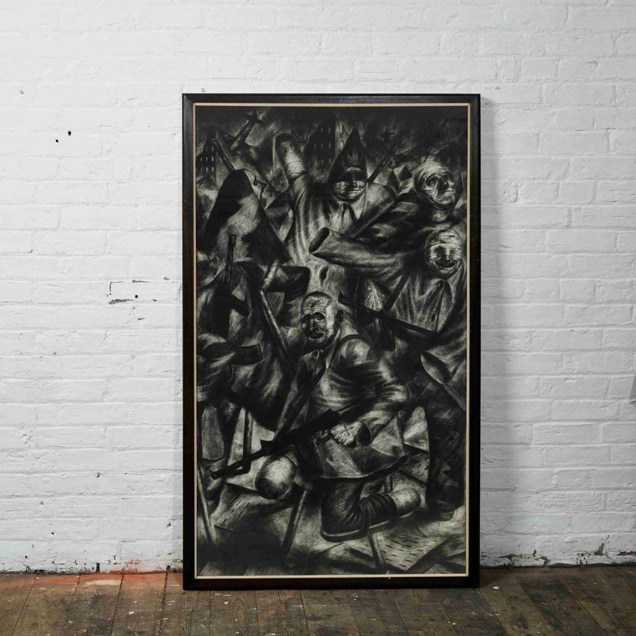 The current work was executed on hand-made paper created by Ken Currie and his friend Keith McIntyre who shared a studio on East Campbell Street in Glasgow, opposite the famous Barrowland Ballroom. McIntyre utilised pulped hospital bed sheets as the base material for this paper which lends this gritty image an extra dimension.