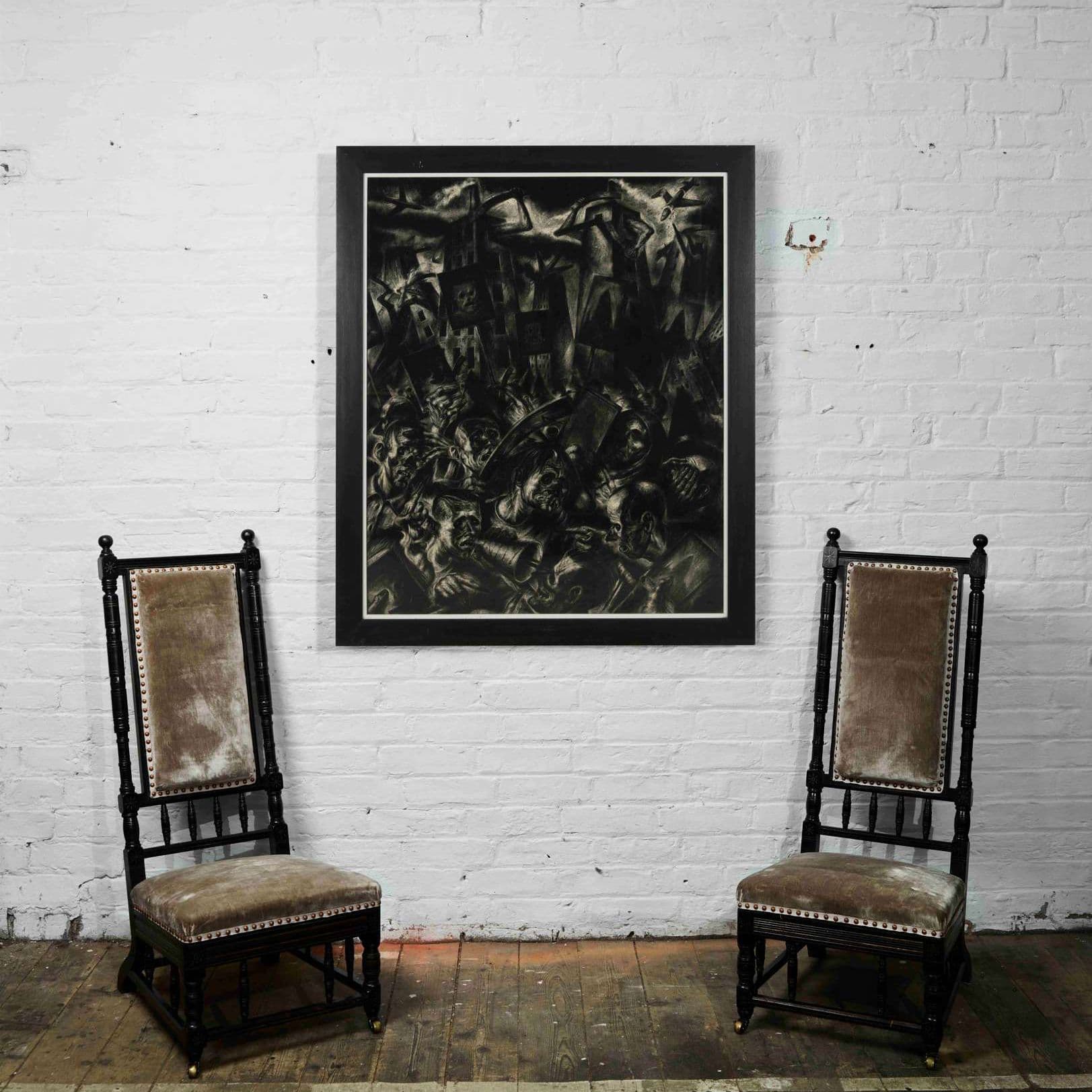 1984, the year the two artworks offered here for sale were produced, was also the year he received a significant grant to make a film called ‘Glasgow 1984’ with a group of unemployed youth from the Cranhill Arts Project, using professional equipment. Currie was intensely engaged with filmmaking at this point, a medium which afforded him the perfect vehicle with which to produce community-engaged art. He had temporarily almost wholly abandoned painting at this point, finding filmmaking both hugely powerful but also an all-consuming endurance test. After the film was finally completed, he felt drawn to return to the looser medium of charcoal, “…retracing my steps stylistically to a time perhaps in my third year at art school”.
