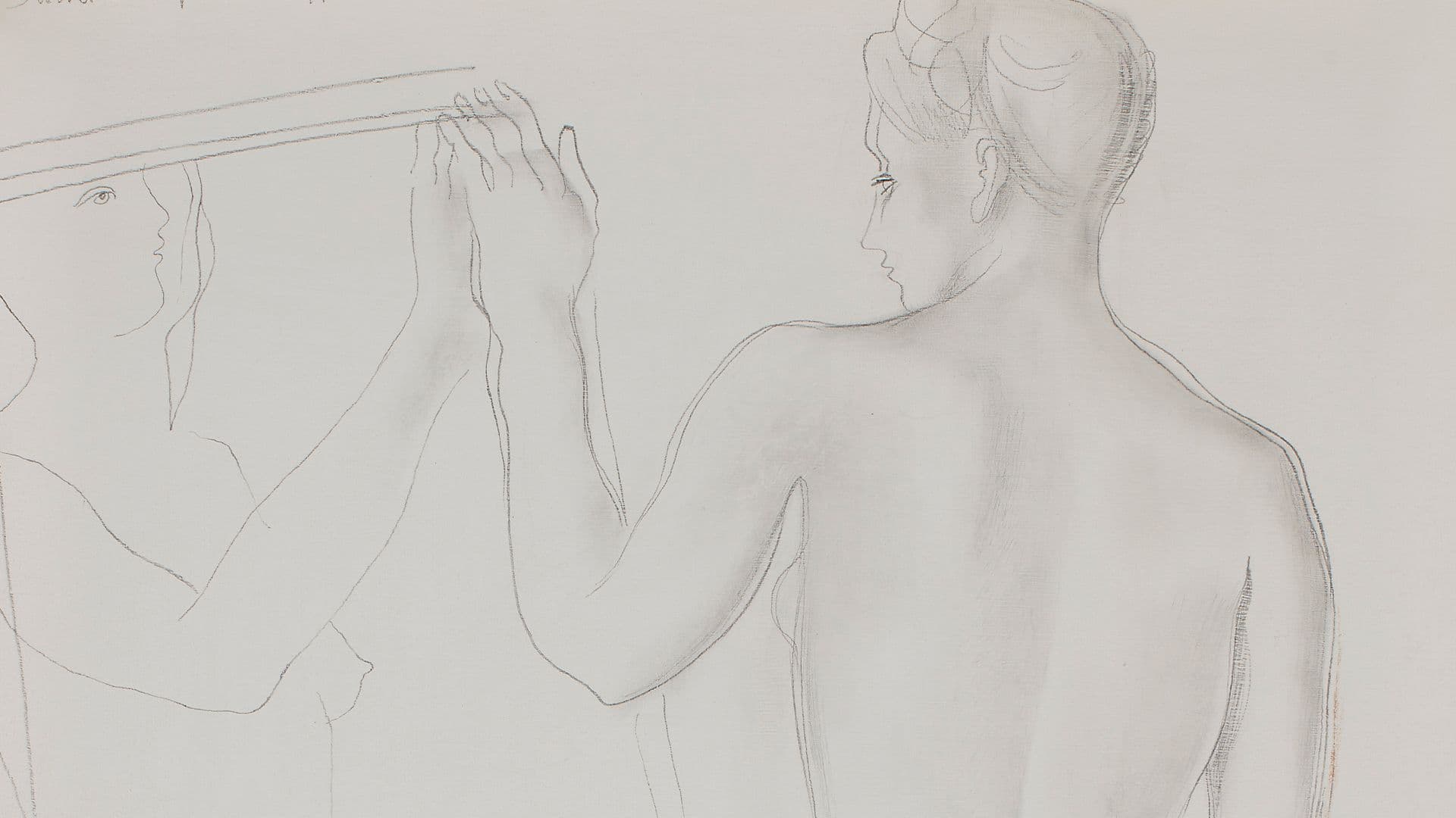Towards the end of her 1941 diary, Barns-Graham compiled an alphabetical list of ‘Artists studied: with works and notes’. It includes Nicholson, but not Hepworth. This does not seem to have affected the women’s friendship, as witnessed by Hepworth’s presentation of her pencil and gesso on board drawing, Figure and Mirror of 1948, to Barns-Graham on her marriage to the architect and urban designer David Lewis the following year. It is a beautiful work. A finely rendered three-quarter length standing female nude is viewed from behind, her curvaceous figure realised with the subtlety of a sculptor’s draughtsmanship. The subject is shown touching her reflection in a mirror to the left, in which she can be seen from the front in more lightly realised form. The work is a testimony to one of the first friendships which Barns-Graham made on arrival in Cornwall and also to one of her female peers within the celebrated St Ives School. Barns-Graham was to keep Hepworth’s Figure and Mirror for the rest of her life.3