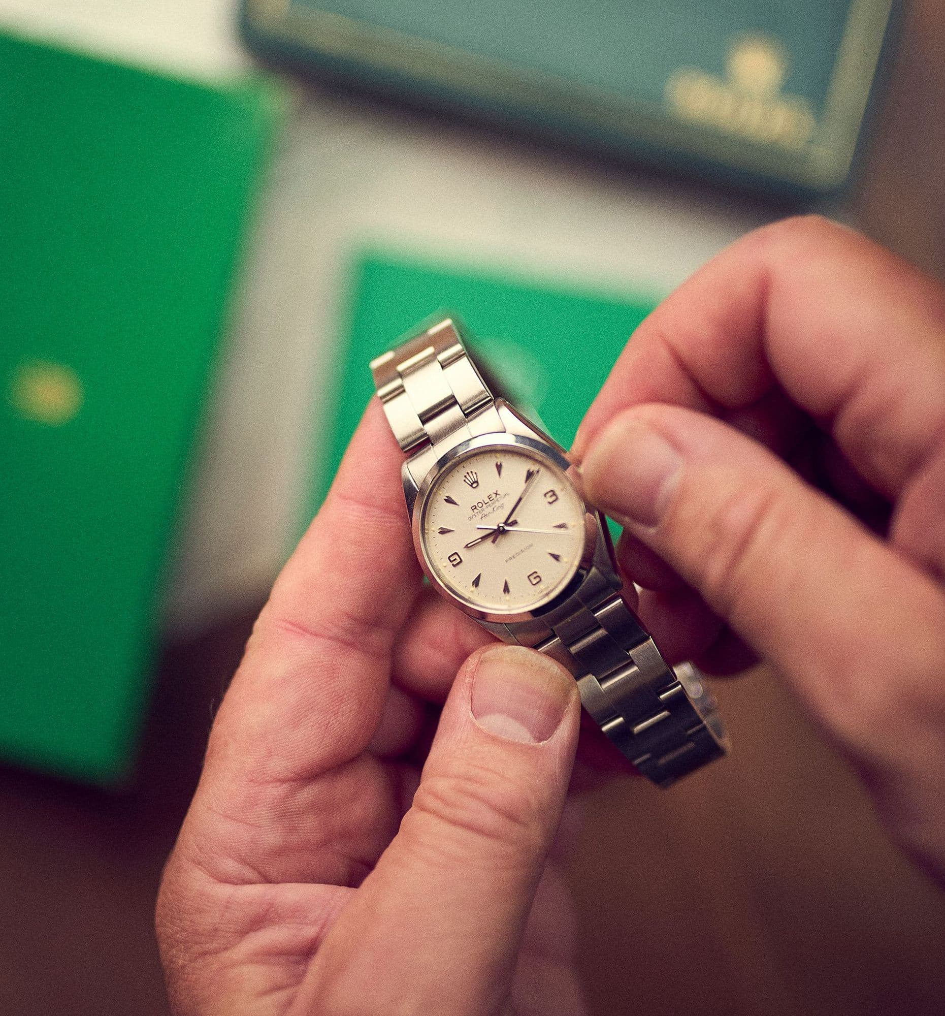 The case design of the Ref.8206 is quite unusual for Rolex and would explain the very small number produced, constructed in a two-piece substantial structure similar in feel to the famous Patek Philippe rectangular 2440/2441/2442 references, it features heavy curled lugs that were fashionable for the period. To this day, the case on the example offered opens and closes with a reassuring ‘snap’ sound due to the tight-fitting solid construction.