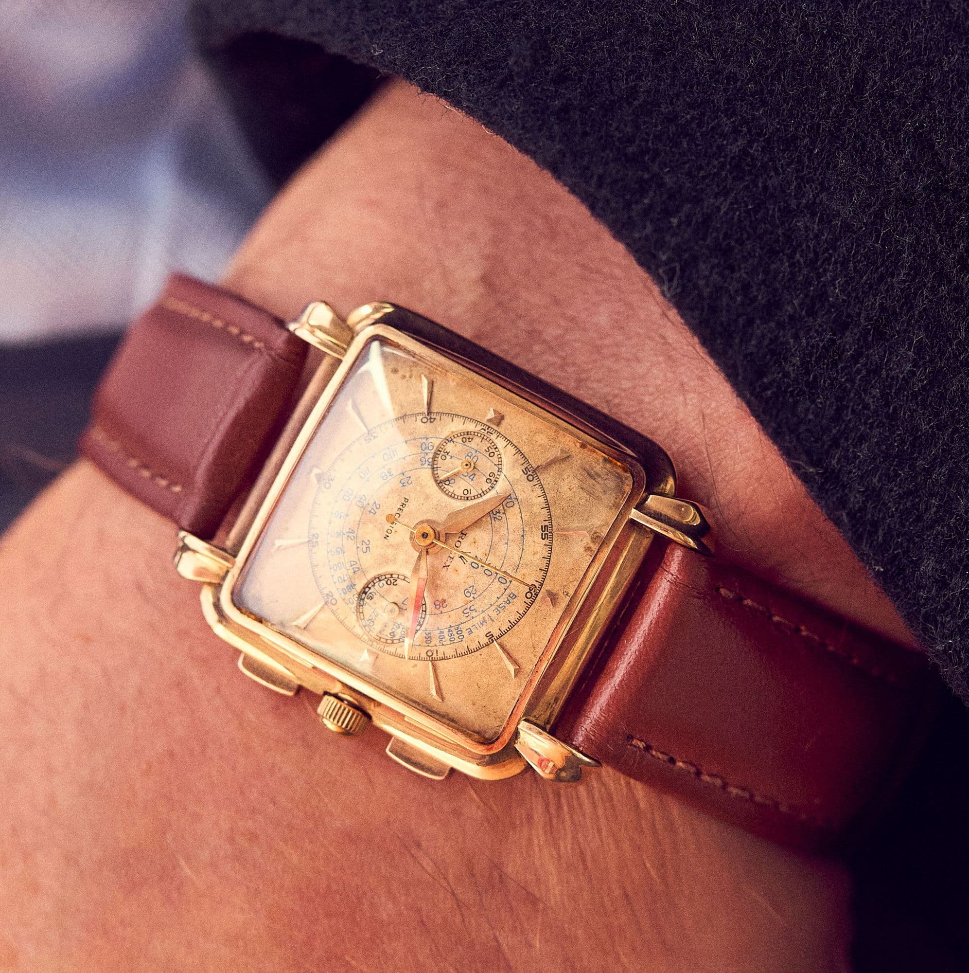 Rolex. A exceptionally rare and unusual square cased 18k pink gold chronograph wristwatch
