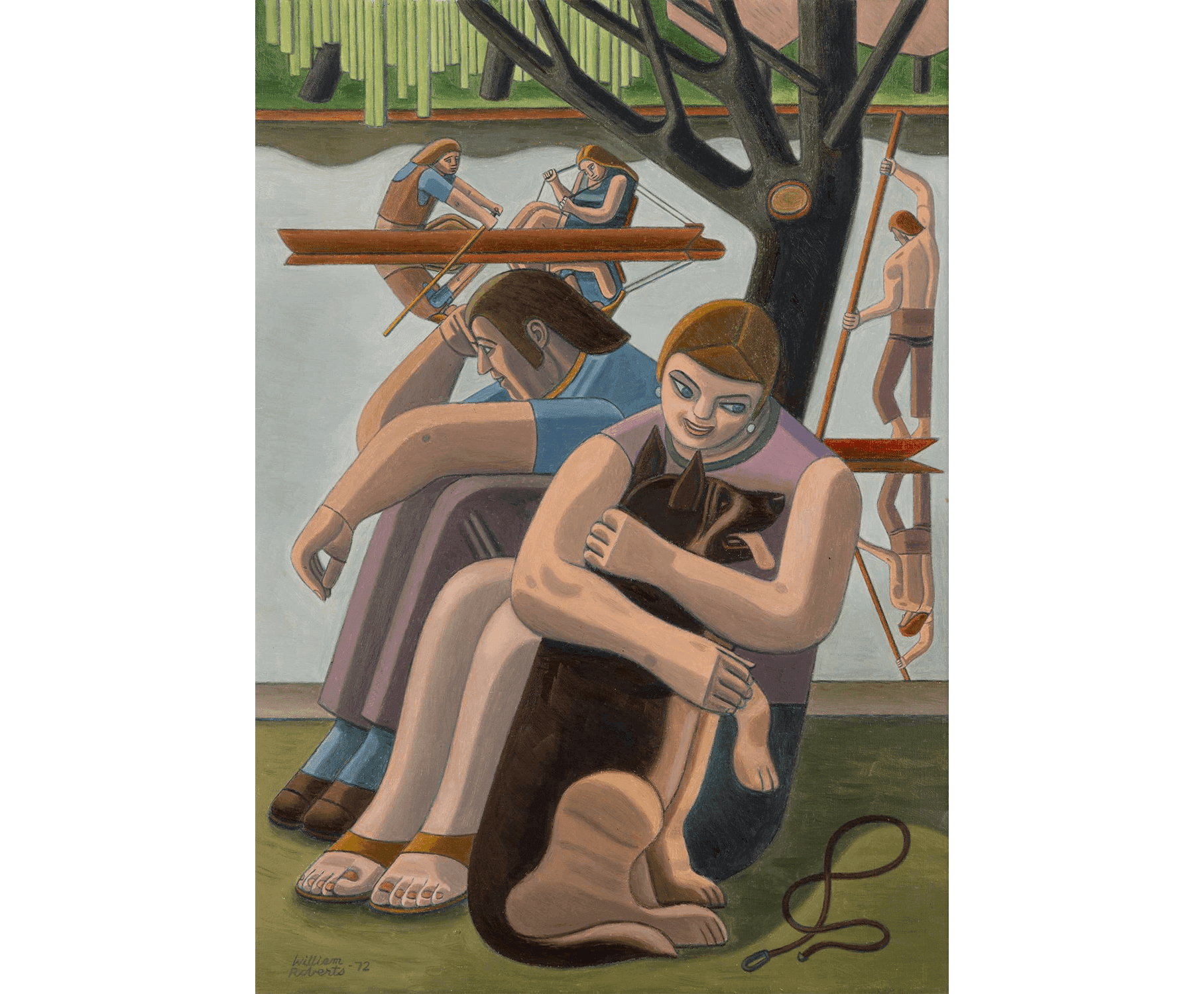 A multi-layered narrative plays out before the viewer’s eye, from the affection between dog and woman in the foreground, the apparent boredom of the man beside her, as referred to in the work’s title, to the angularity of the rowers and punters reflected in the still water; each person appears to be in a world of their own. A strong sense of the horizontal and the vertical provides structure to the composition, which recedes through several spatial planes to reach the far bank.